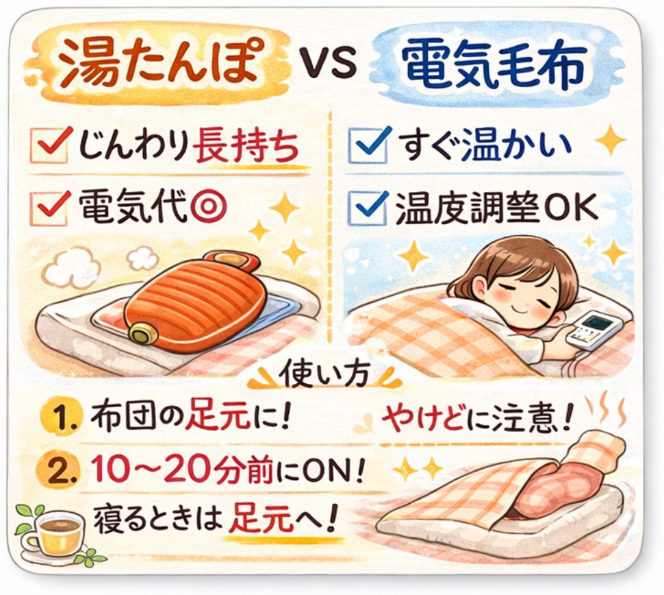 • 次に**湯たんぽ(メイン)/電気毛布(サブ)**で先に温める
